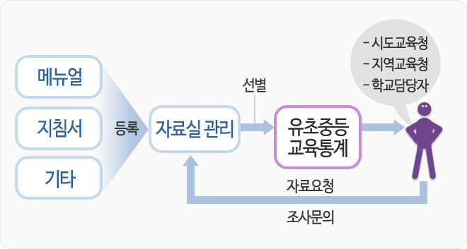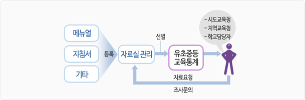 시도별 맞춤 통계자료 서비스의 활용을 위해 필요한 자료(시도별 맞춤 통계자료 서비스 시스템 활용 메뉴얼, e-book 메뉴얼 등) 뿐만 아니라, 유초중등 통계조사를 위한 지침서, 조사 가이드 동영상 등 조사의 원할한 운영을 위한 자료들을 제공합니다.